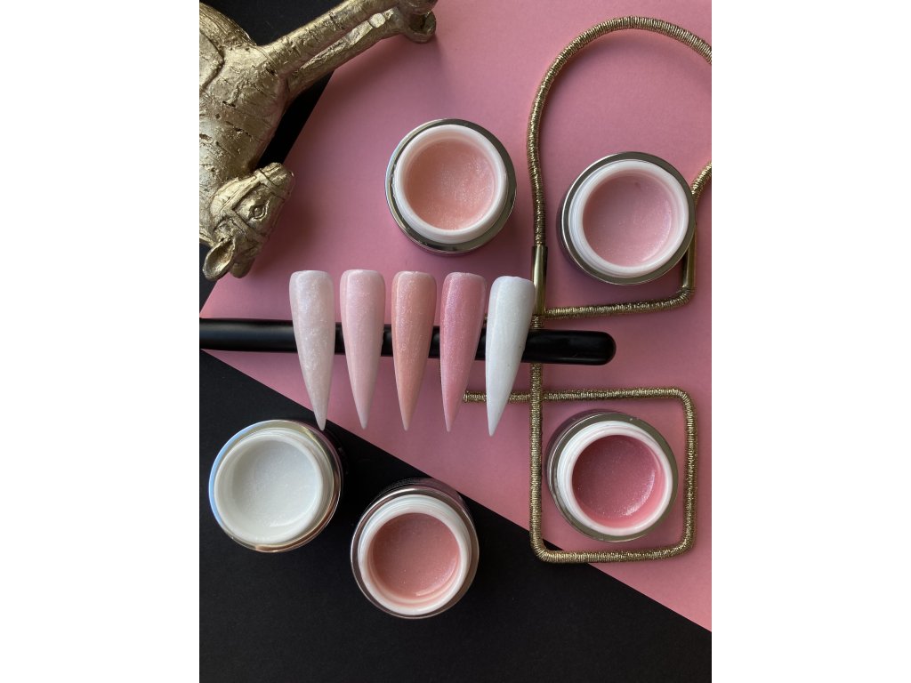 - Jednofázové, priesvitne-ružové, kamuflážne a biele modelovacie UV/LED gély.